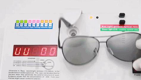 通过紫外灯检测,我们可以看到眼镜在紫外线照射下变成了深色,表明偏光镜能有效隔绝紫外线。。