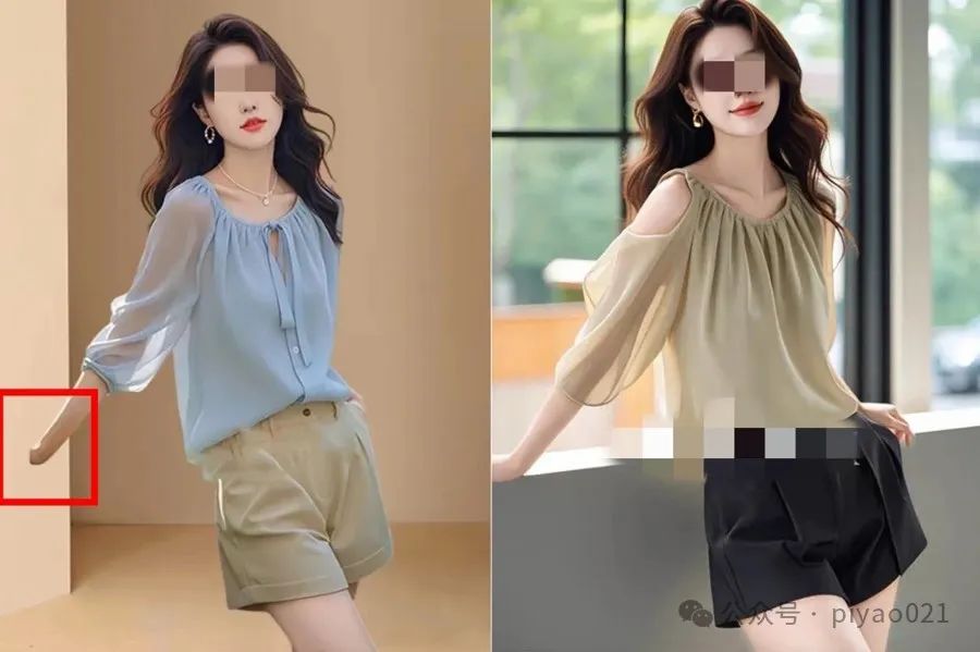 不同的商家使用相同的“AI模特”进行“卖家秀”。模特的姿势和表情完全一样。甚至有些模特因为修图不仔细而缺胳膊缺腿。