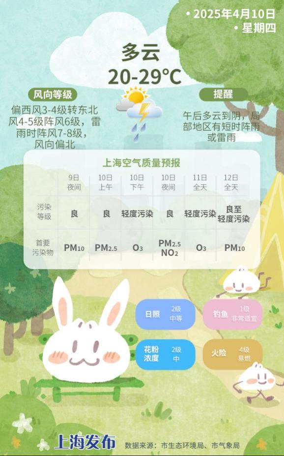 今天主要是阴天,温度在20~29℃之间。白天接近夏天的温度为大气提供了大量的热能。此外,风向由西向东北转变,有利于下午局部对流天气。所以今天下午要注意小规模、短时间的阵雨或雷雨,以及雷雨时的7~8级偏北阵风。