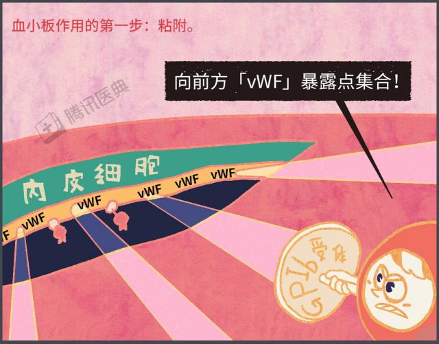 当你受伤流血时,血管里有一层屏障叫做内皮细胞。当内皮细胞受损时,一个代号是“ vWF "这些因素会显现出来,此时,血小板手中的探测器就会发挥作用: