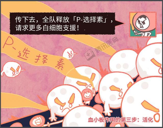 激活的血小板会暴露 P- 选择素,聚集较大的白细胞,堵塞伤口,清除细菌。