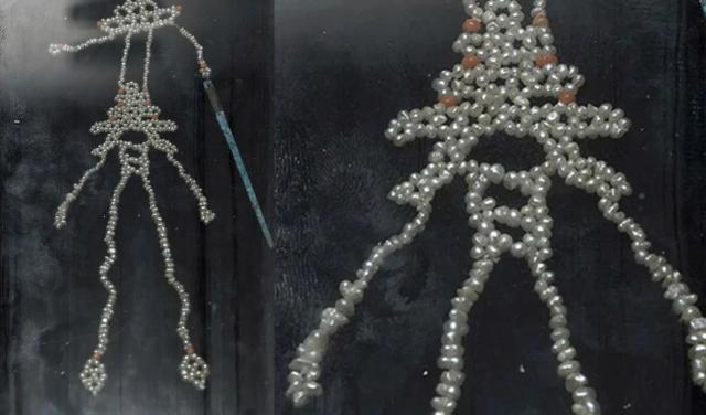 值得注意的是,许多人认为挑牌只是两串珠子挂在冠上,事实上,挑牌(应称之为挑牌簪可能更适合)这是一款整体头饰,包括两部分:一部分是金发簪(多为翟头簪、凤头簪、龙头簪、荷花簪等);另外一部分是垂珠结,有纯珍珠串联,也有晶石。 珍珠串联,可以说是十分华丽。
