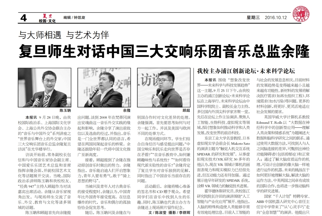 复旦大学与上海交响乐团的情感纽带经久不衰。2016年,时任上海交响乐团音乐总监的余隆受复旦大学邀请,为大学生设立讲座。2019年,上海交响乐团迎来140周年。复旦大学以“在浮躁的世界里永远保持内心的平静,请用音乐点亮复旦人的精神领地”为初心,参加了他们举办的“同城交响乐”活动,并向上海交响乐团发出邀请,让音乐再次渗透校园。