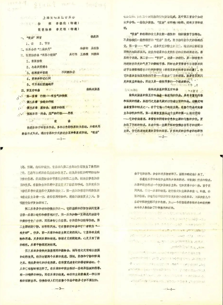 1980年3月19日,著名中央乐团指挥家李德伦带领上海交响乐团在复旦大学表演。表演曲目包括中国琵琶协奏曲《草原英雄小姐妹》,以及法国印象派作曲家德彪西的《云》和《节日》。、弦乐合奏《二泉映月》和柴可夫斯基的《第五交响曲》。这次表演,吸引了当时很多音乐家的目光。