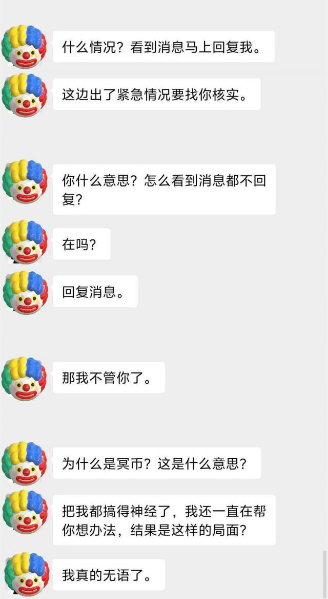 没想到,骗子“上线”得知自己收到了。 5 万冥币之后,瞬间破防,连续发了十几条信息问受害者:“为什么是冥币?这是什么意思?”“这让我疯了,我一直在帮你想办法。结果是这样的情况?”