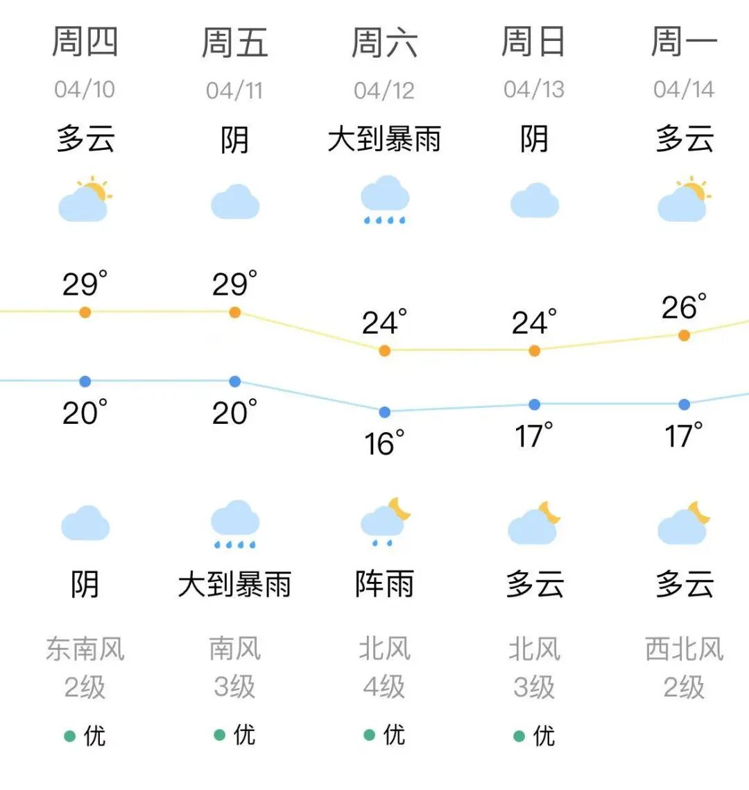 预计四月十日至十一日,阴天为主,偶有(雷)阵雨,气温20~29℃;