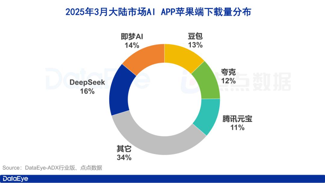 点点数据显示,2025年3月,大陆市场AI 苹果端预计APP下载总量将达到4020.0万次(无重复下载)。在这些方面,DeepSeek、即梦AI、豆包、夸克和腾讯元宝位居TOP。 占市场66%的比例。