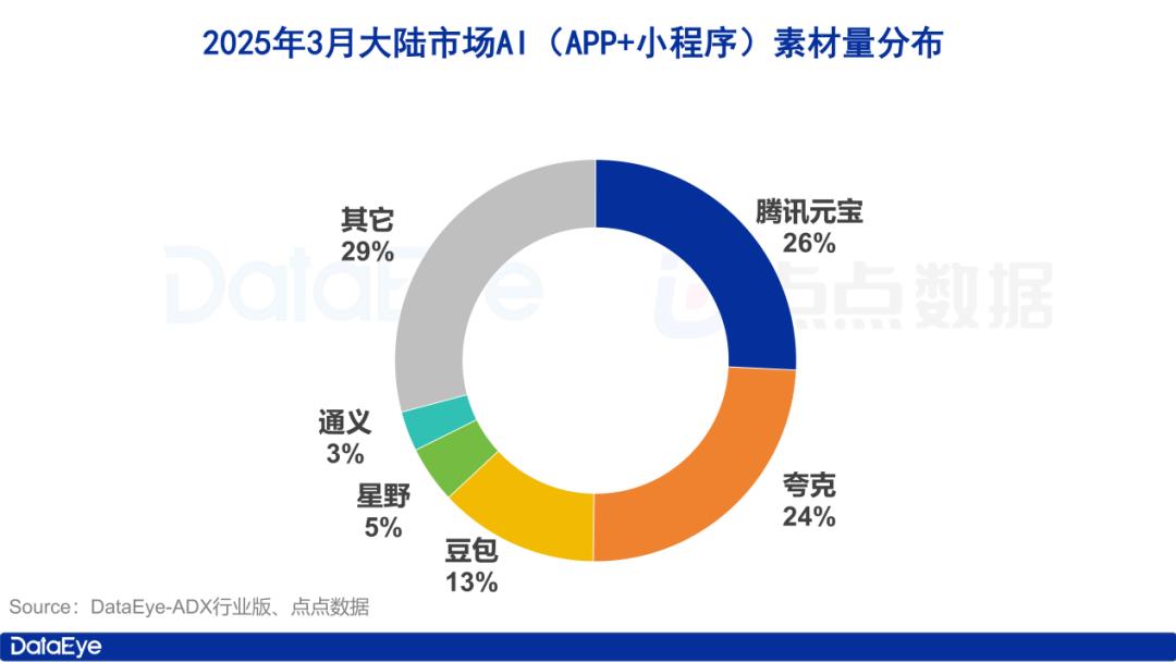 ADX行业版数据显示,2025年3月,mainlandChinaAI产品投放数量达到95.7万组。其中,腾讯元宝、夸克、豆包、星野、通义在材料投放榜上名列前茅。 这5款应用占据了大陆市场整个AI产业每月71%的投放材料。