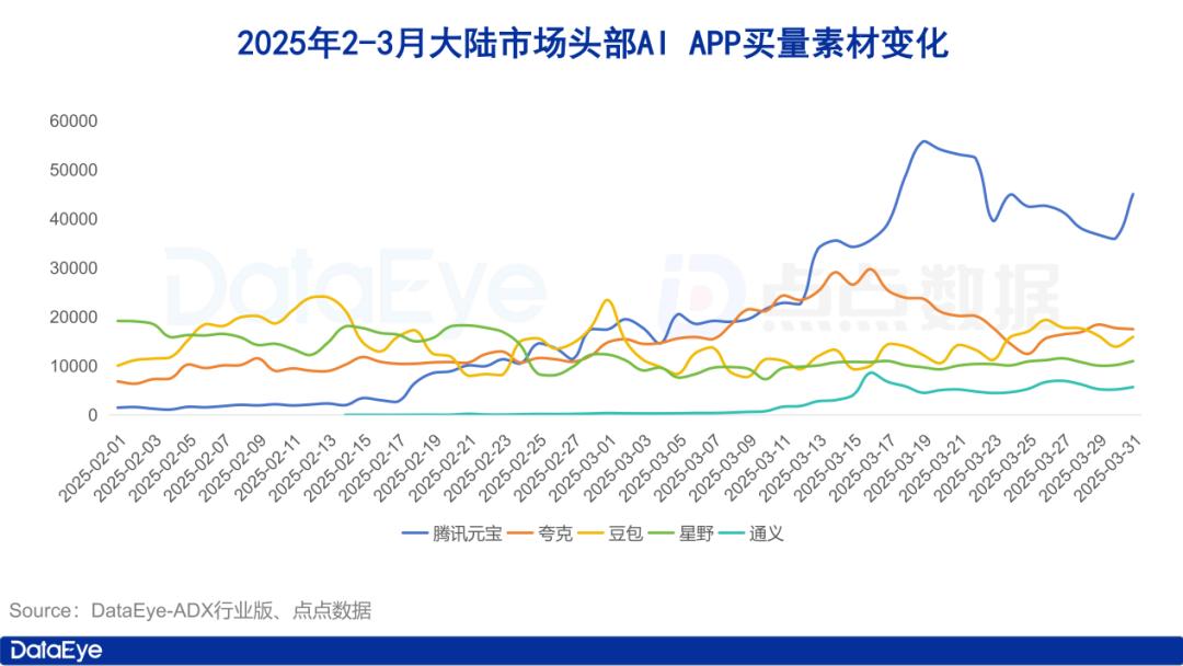 ADX产业版数据显示,2025年3月,腾讯元宝正式登上购买量素材榜首,其次是夸克、豆包,TOP 三个应用程序形成了腾讯、阿里和字节的“三国杀”。