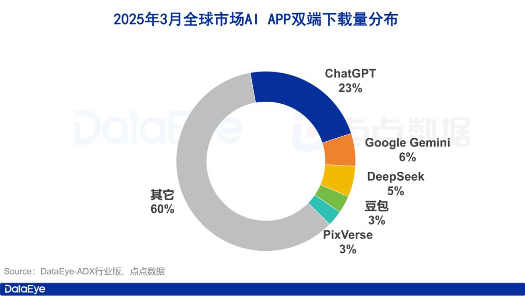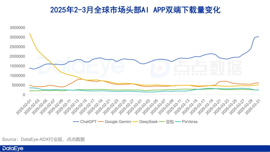 点点数据显示,2025年2月至3月,全球市场头部AI 预计APP双端下载量呈现出明显的“一家独大”格局。