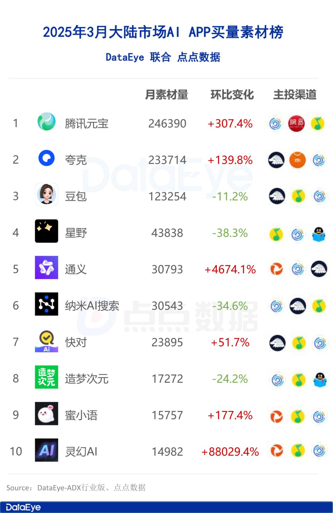 ADX产业版数据显示,2025年3月,大陆市场领先AI APP购买量格局发生了巨大变化。