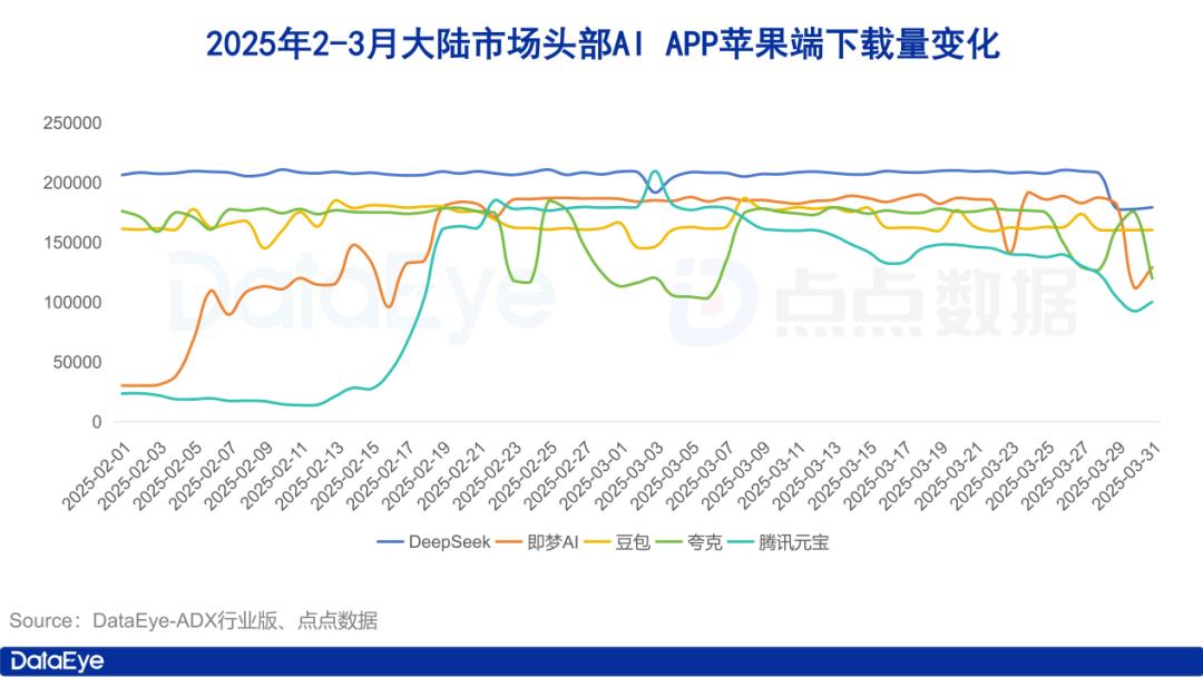 点点数据显示,2025年3月大陆市场苹果端AI DeepSeek在APP下载量榜单中排名第一,Kimi智能助手在2月份滑落至第六。