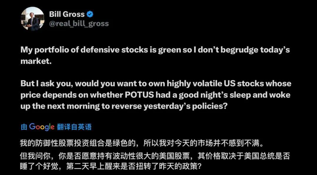 “债券巨星”比尔·格罗斯在X上的灵魂问题也值得投资者考虑:“你愿意有价格取决于美国总统是否睡得好,是否推翻了昨天政策的大起大落。美国股票吗?”