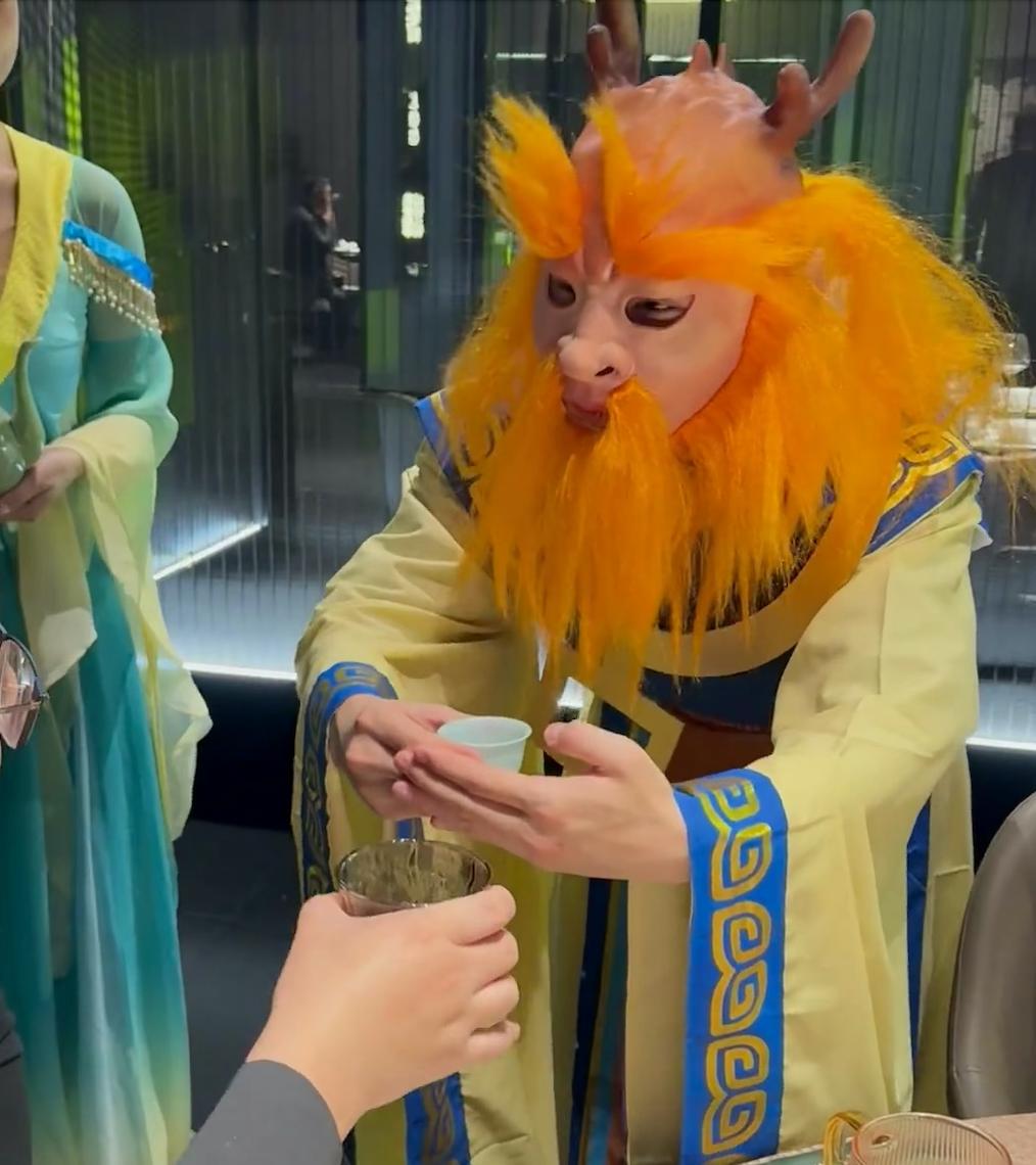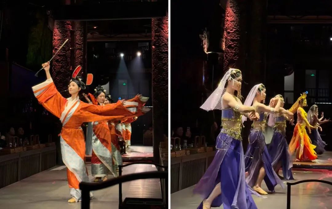 然后是表演环节。当我们进入宫殿时,每个人都围着圆形中央舞台排列,然后开始喷烟,营造一种烟雾弥漫的氛围。穿着汉服的小姐姐们举行礼物,倒着喝酒。演出开始了,一场歌舞演出后面还有一道菜,莺歌燕舞,吃饱喝足!