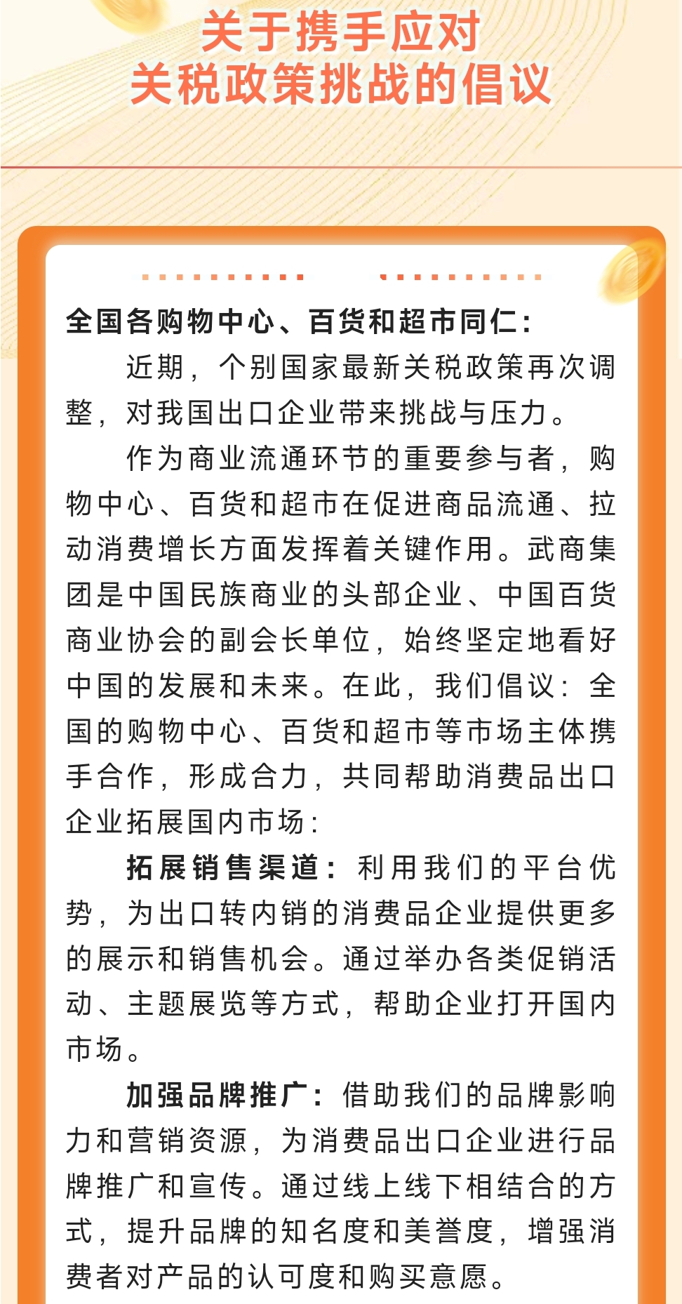 武商集团倡议:全国购物中心、百货、超市等市场主体共同努力,共同帮助消费品出口企业拓展中国市场。