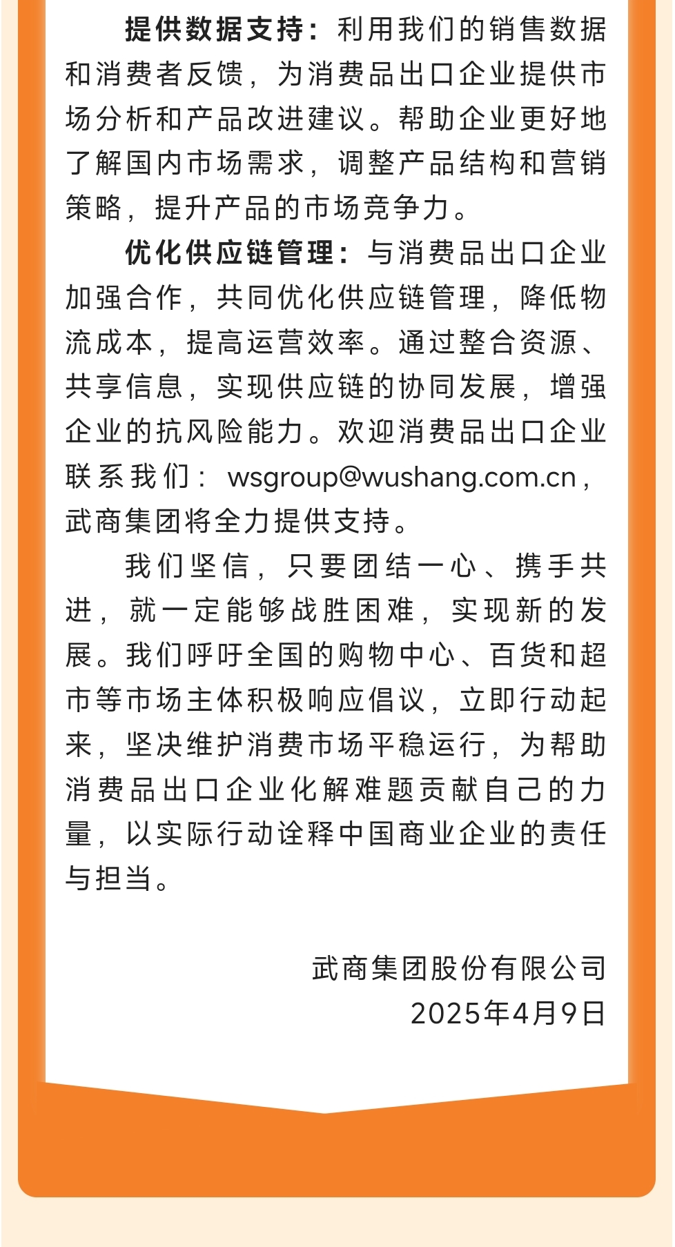 4月10日,武商集团在其微信官方账号武商潮上发布倡议,将采取四项措施,协助消费品出口企业拓展中国市场,呼吁全国各地购物中心、百货公司、超市等市场主体积极响应倡议,立即采取行动,坚决维护消费市场稳定运行,为帮助消费品出口企业解决问题做出贡献。