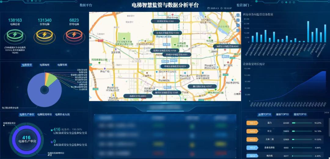 整合电梯全生命周期数据,实现数据共享共治,实现“以平台管理数据,以数据管理状态,以状态管理安全”。通过制定统一的数据采集、清理和存储标准,收集和输入电梯安装、维护和检测的所有环节数据,有效整合数据资源,打破数据“荒岛”,实现数字化、标准化、共享化和可追溯性的控制数据。全方位、多维度展示电梯数量、类型、场所、年限、分布等数据。,并利用GIS地图准确定位每部电梯的精确位置,动态掌握每部电梯的详细信息,实现“状态清晰准确”。以“数据驱动控制”为核心,利用平台定期、定量的统计分析控制重点,提高风险预测能力和精准控制水平,为监管机构提供数据支持,提高管理质量和效率,科学高效地做出决策。到目前为止,平台已经收集了15万多条电梯相关数据,29万多条电梯运行管理相关数据。