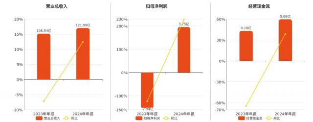 企业总营业收入为 121.99 亿元。归母净利润为 3.75 十亿元。经营活动现金净流入 5.68 亿元。