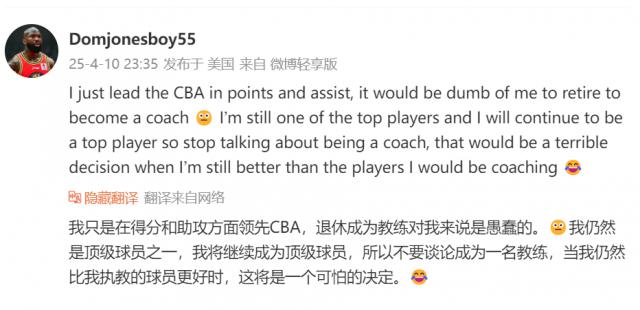 最近琼斯已经回到美国,因为 CBA 还没有结束,NBL 没有开始。然而,他回到美国后,为了招待自己,买了一辆豪车。然而,在评论区,球迷评论 : 下个赛季回到吉林当主教练。琼斯说:为什么?我仍然是最好的球员之一 ! 这句话很清楚,琼斯觉得自己的能力还是很强的。