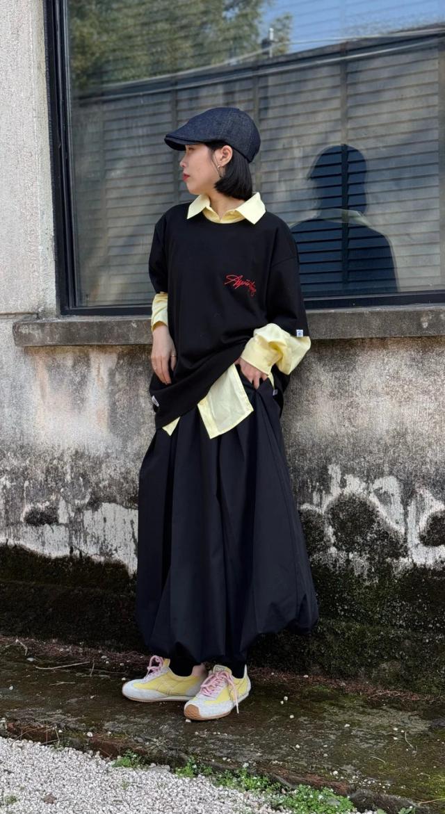 本梨形身材亲测:微宽松 H 风格将腰腹的小肉藏得紧紧的,落肩设计很好的修饰了肩部和背部,衣领也衬得脖颈线条很好看。