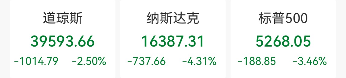 在收盘时,道指比前一交易日收于39593.66点,下跌2.50%;标准普尔500指数收于5268.05点,下跌3.46%;纳指收于16387.31点,下跌4.31%。