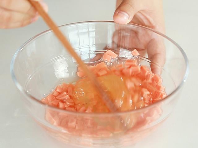 3 在火腿丁中加入一个蛋白质,同样搅拌均匀。