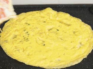 轻轻摇晃大锅,使蛋液均匀摊开,小火煎熟。