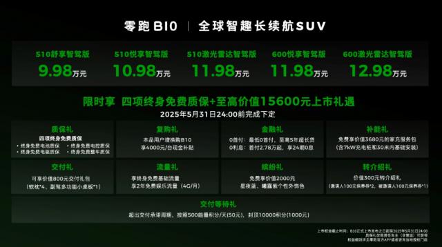 4 月 10 日消息,零跑 B 系列首车 B10 上市时,共推出5款配备车型,售价区间 9.98-12.98 一万元,第一次把激光雷达带到这里 12 万元以内。