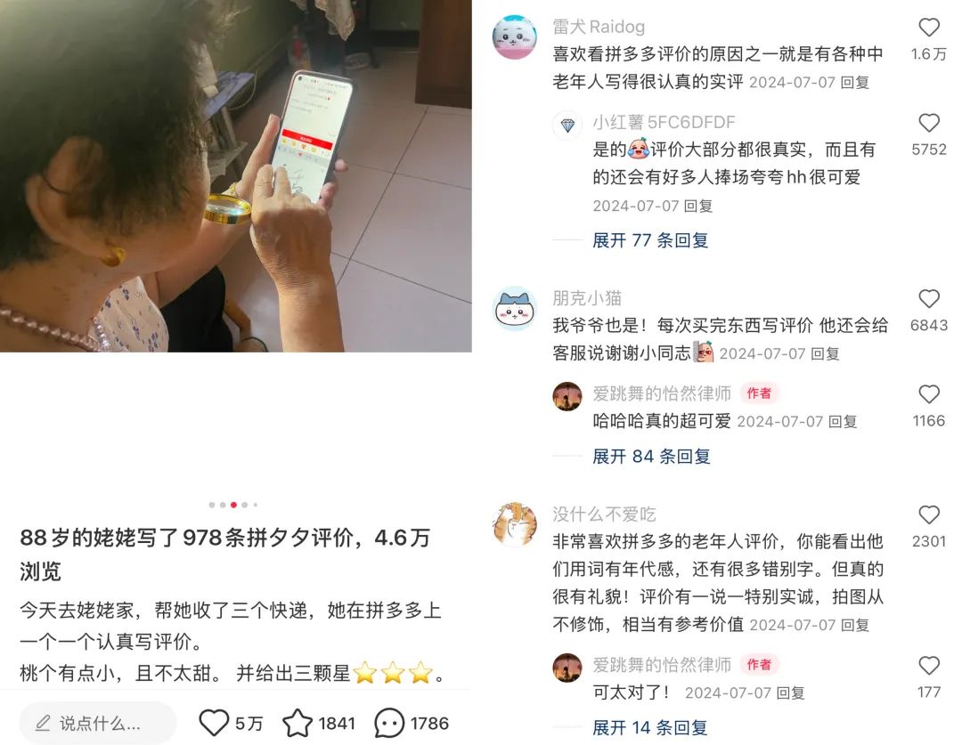 2024年,一位博主发现,他88岁的外婆在拼多多写了978条评论,访问量为4.6万人。奶奶认真给每个包裹写评论:桃子有点小,不太甜,给三星;衣服已经收到了,非常适合穿。
