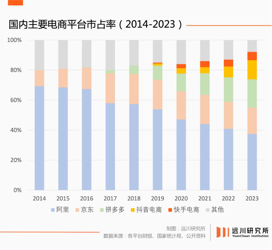从2014年到2024年,中国电子商务的主要参与者已经从阿里/JD.COM转变为阿里、JD.COM、拼多多、Tiktok、Aautorapper五大企业。算上正在电商发力的腾讯(视频号),有六家企业。