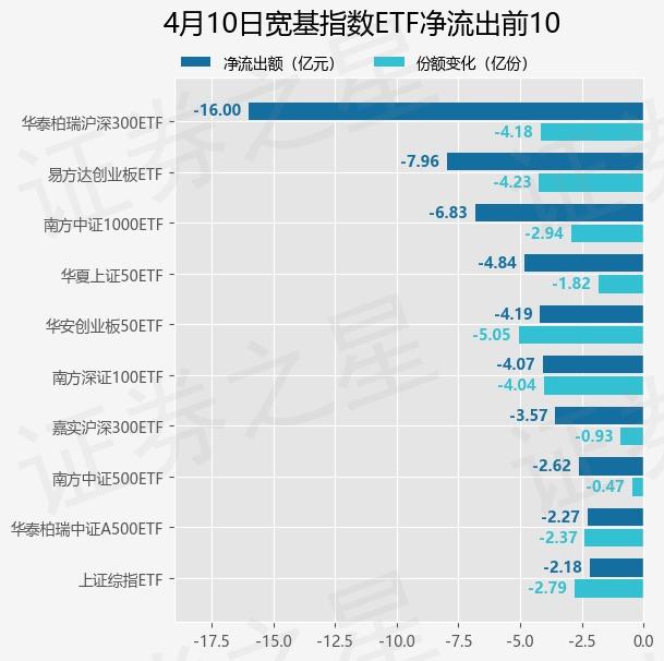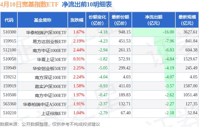当天有 120 只宽基指数 ETF 资金出现净流出,其中华泰柏瑞沪深深排名第一。 300ETF(510300)减少了份额 4.18 一亿份,净流出额为 16.0 亿元。