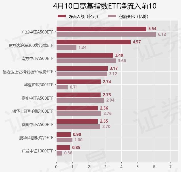 当天有 56 只宽基指数 ETF 资金净流入显示,其中净流入排名第一的是广发中证。 增加了A500ETF(563800)的份额 6.12 十亿份,净流入额为 5.54 亿元。