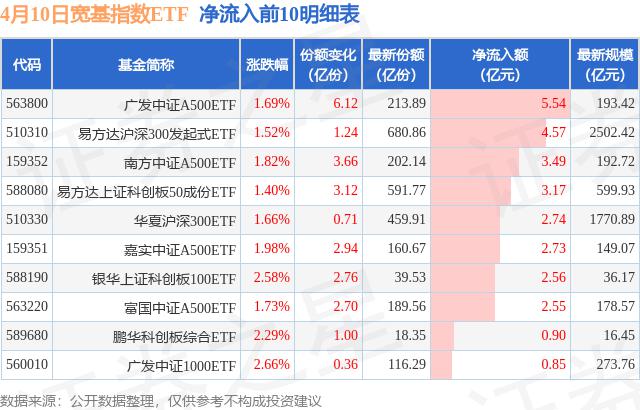 证券之星消息,4 月 10 日宽基指数 ETF 总资金净流出基金 41.33 亿元,近 5 一个交易日累计净流入 1673.69 亿元,5 在一个交易日内,出现了日合计资金净流入。 4 天(ETF 计算资金流入的方法:(当日 ETF 现场流通份额 - 前一交易日 ETF 现场流通份额)* 当天 ETF 均价,数值仅供参考)。