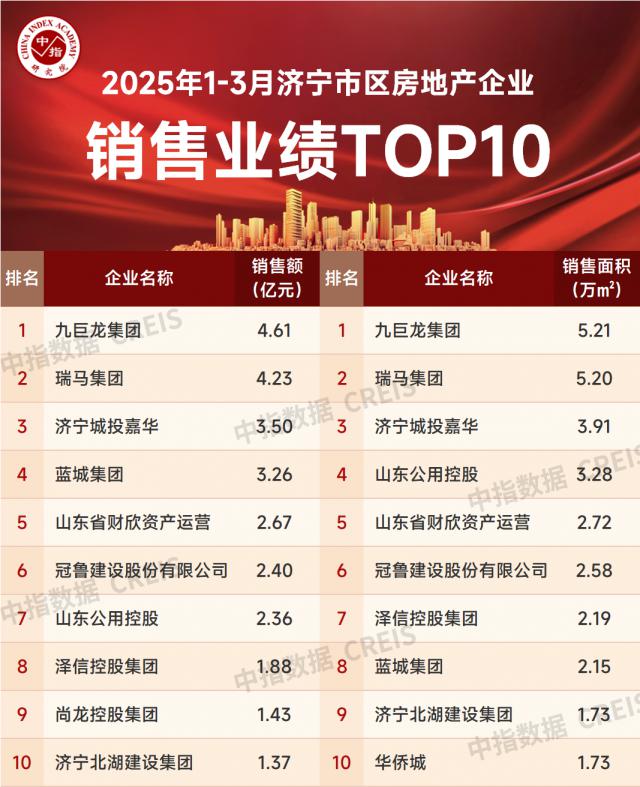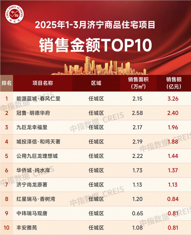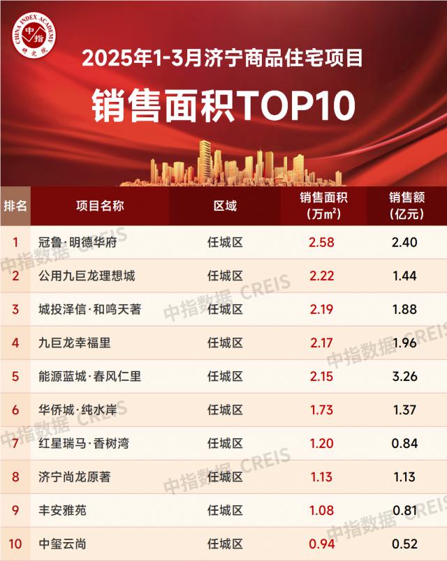 特别声明:房地产企业销售数据统计是 2025 年 1-3 月度销售的商品房为统计口径,主要根据济宁市城区(不含县市)中指研究院的销售统计数据,参照企业提供的相关数据,公司提供的相关文件也包含在少数未在监测范围内的项目的统计范围内,经审核纳入统计范围,集中在线签约的已售罄项目不列入名单。本次列表仅供参考,研究小组对使用列表及其内容造成的任何直接或间接损失不承担责任。