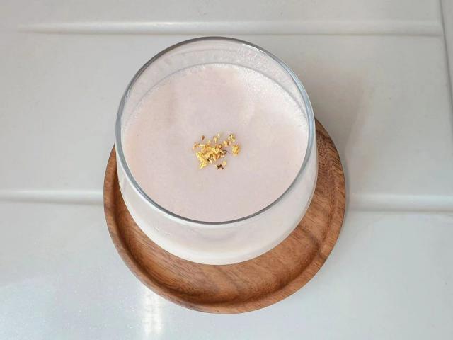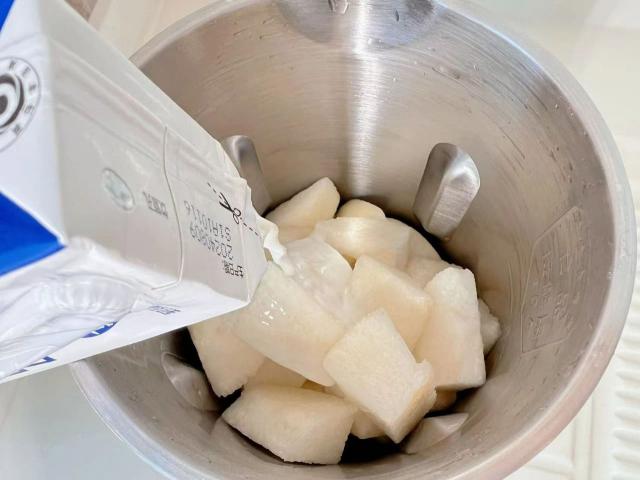 1. 将雪梨去皮切成块,加入牛奶搅拌成汁。