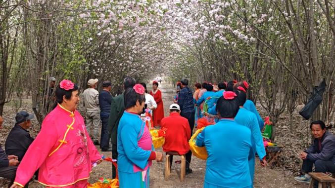 走进种植园,粉色和白色的海棠花重叠,挂满枝头。微风吹过,花瓣像雪一样飘落,梦幻般的。海棠花海不仅是视觉享受,也是休闲的最佳场所。白岳秧歌队来自农村,穿着鲜艳的衣服,手里拿着红丝和折扇,随着音乐在花丛中跳舞,精彩的表演吸引了许多村民观看。游客们忙着在这里打卡拍照,用镜头记录下这个美好的瞬间。
