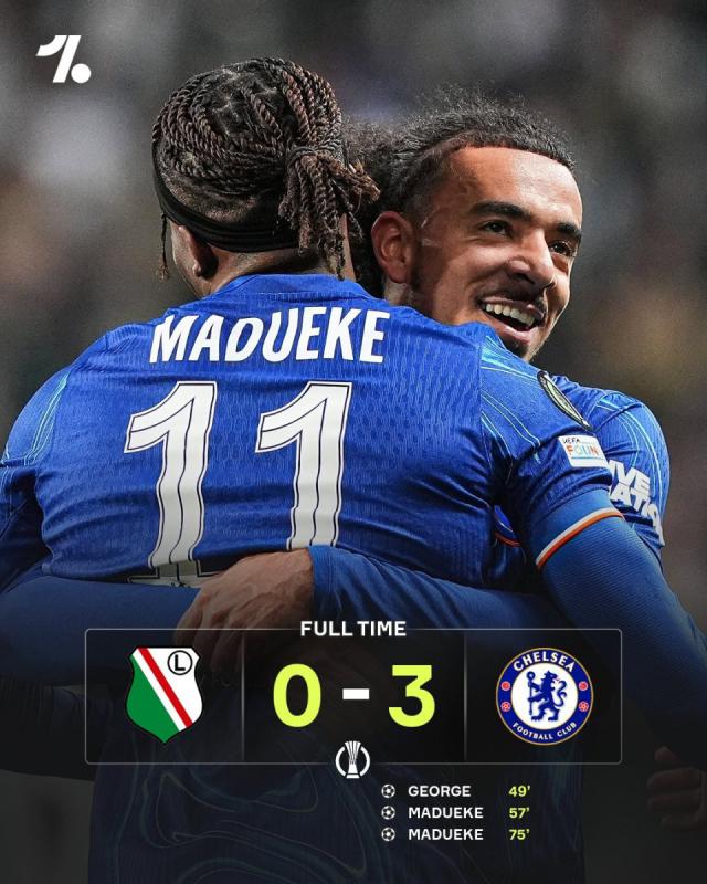欧协联 1/4 最后一轮,切尔西客场比赛 3-0 赢得华沙莱吉亚,领先。乔治打破僵局,桑乔帮助马杜埃凯破门,恩昆库丢失,桑乔帮助双响,马杜埃凯梅开了两次。[详细信息]