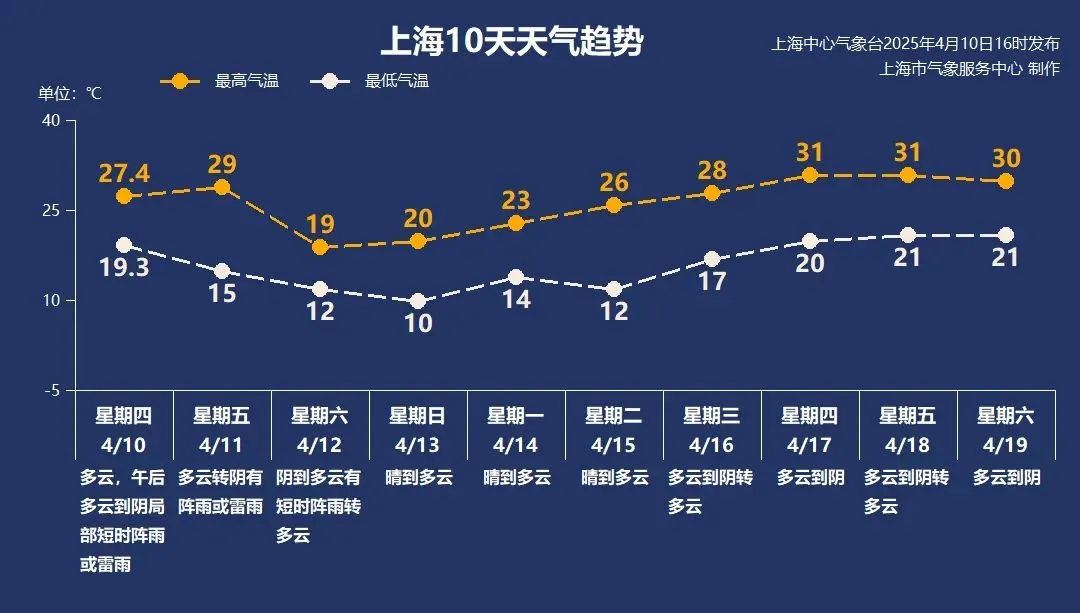 周六上午,冷空气开始影响当地。白天气温一路下降,体验明显变冷变冷。周日上午,最低气温降至10℃左右。周六和周日上午,风很大,最大的陆地阵风是7~8级,临江沿海城市和长江口区8级~10级,洋山港区及上海市沿海海面9级~11级。从星期天下午开始,风速逐渐下降。