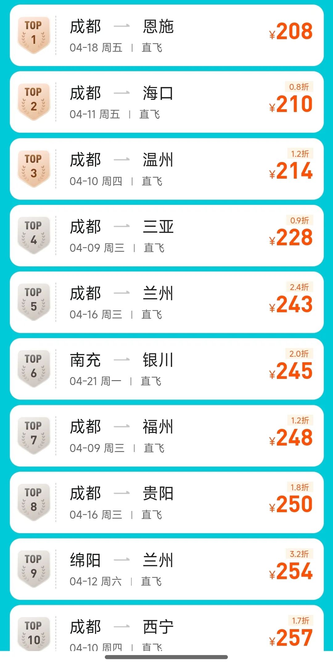由于燃料附加费下降,航空公司纷纷推出特惠机票。记者查询了多个票务平台,发现在国内航线方面,成都始发航班的价格优势尤为明显。4月11日,成都-海口航道最低票价210元,相当于0.8折;4月9日,成都-三亚航道最低票价228元,相当于0.9折;4月10日,成都-温州航道最低票价214元,相当于1.2折。