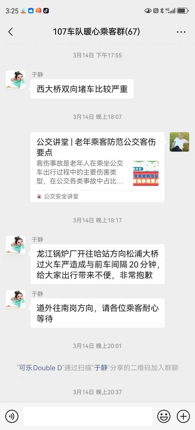 “建立乘客微信群,更多的还是想多渠道听取乘客的意见,解决问题。”公共汽车 205 路车队原队长于天恒告诉记者,2024 年初线路创建微信群,不到一年,已经存在。 100 多个线路固定乘客加入群。小组从一开始只接受乘客的投诉,后来功能不断扩展:提供出发时间、实时路况、失物招聘信息、线路运行信息等。小微信群已经成为车队准确捕捉民生需求的“传感器”。