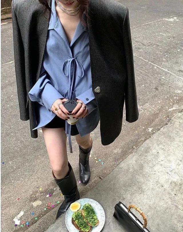 斜切领子正好停在锁骨下面的两个手指上,视觉垂直拉伸法术使颈部像天鹅一样纤细。