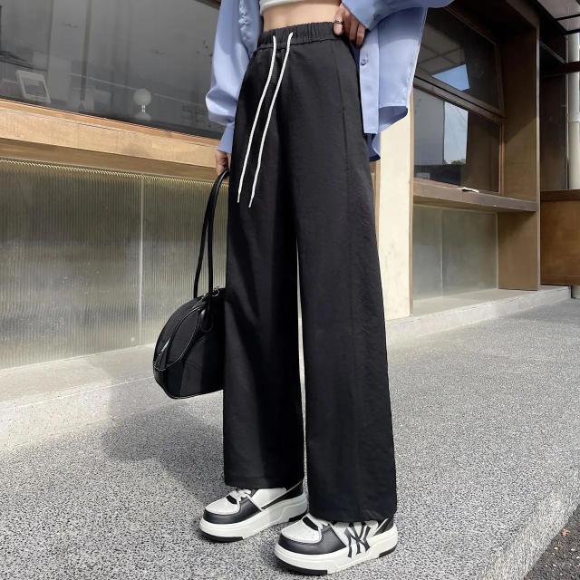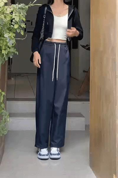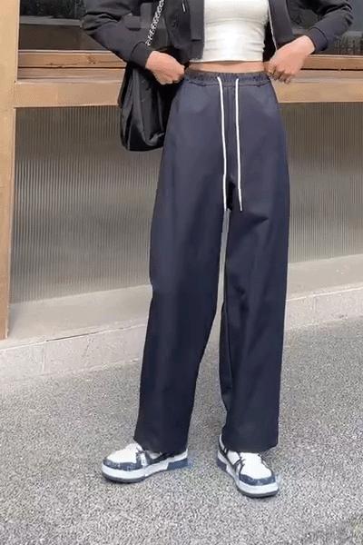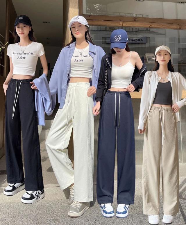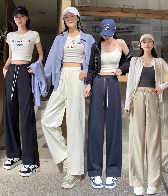 直阔腿款式,垂感足够好,裤管宽松而不拖沓,贴合身体线条,整洁时尚,腿又直又长。 ~