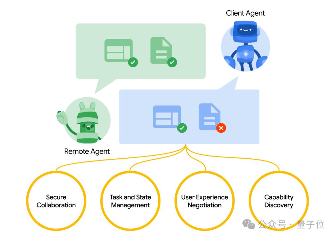 客户端Agent与“远程”Agent之间进行通信,客户端Agent负责制定和传递任务,而远程Agent负责执行这些任务,或者提供正确的信息,或者采取正确的行动。