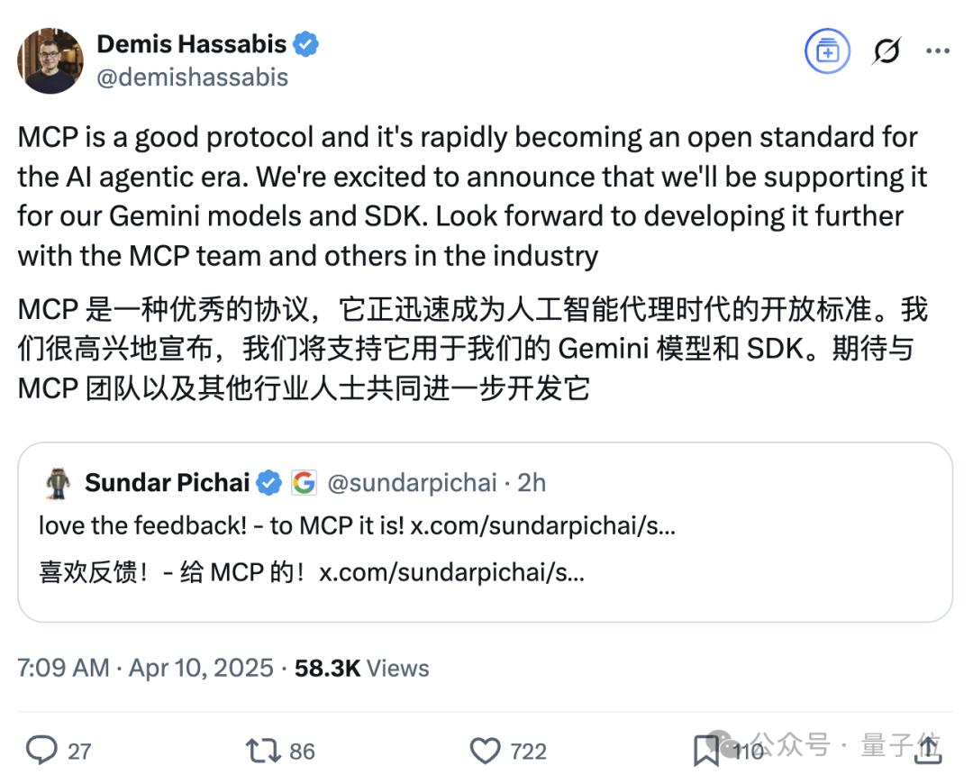 MCP是一项优秀的协议,并迅速成为AI。 Agent时代的开放标准。我们很高兴地宣布,我们将为自己的家庭提供服务。 Gemini模型和SDK为本协议提供了支持。希望能够进一步与MCP团队和行业内的其他多方共同开发和完善这一协议。