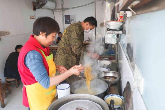 早晨,黎明微露,寿县古城东大街上渐渐热闹起来,这里有古城最朴素的烟火气。汪家小刀面馆里,猪骨煮的汤香扑鼻,老师傅将面条放入锅中,滚水煮沸,捞出装碗,撒上葱花,动作流畅。他说:“我们店已经做了三四十年了,每天可以卖几百碗。”老板汪师傅告诉淮河早报、淮南网记者,他们每天早上6点开始营业,营业到早上10点。小刀面价格实惠,小碗5元,茶叶蛋1.5元。性价比高的小刀面吸引了很多食客,以至于高峰期要排队等半个小时才能吃。