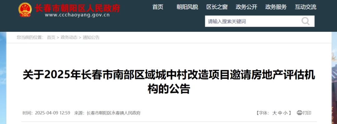 4月9日,长春市朝阳区人民政府网站发布《关于邀请房地产评估机构2025年长春市南部区域城中村改造项目的通知》,详情如下: