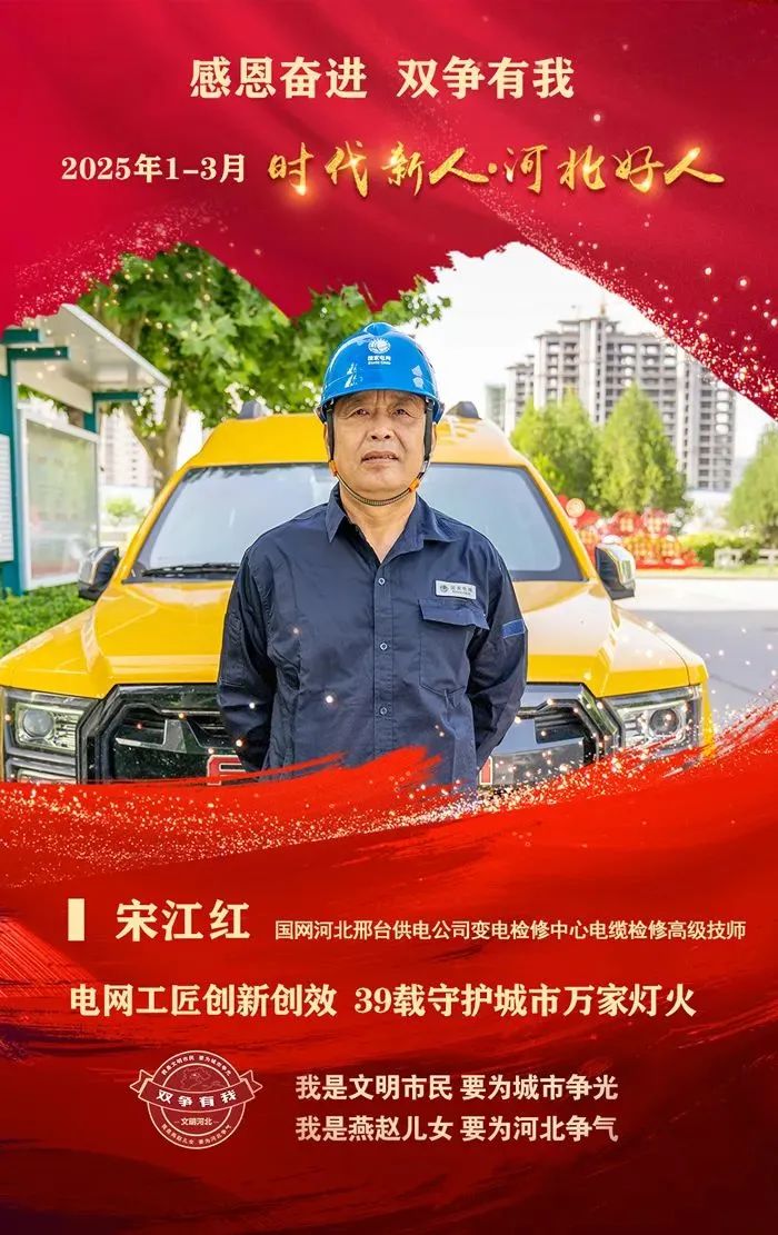 一九六八年十月出生的宋江红,中共党员,国网河北邢台供电公司变电检修中心电缆维修高级技师。自从参加工作以来,他始终牢记“人民电力行业为人民”的企业宗旨,秉承“做一行、爱一行、钻一行”的工匠精神,努力练习电缆维修技术,学习创新创效的方法,冲锋电网抢险一线,守护城市灯光39年。他率先研发的创新成果先后获得中国能源化学地质系统优秀员工技术创新成果二等奖、国家电网有限公司发明专利奖三等奖、河北省总工会优秀员工技术创新一等奖、河北省供电系统员工技术创新一等奖等奖。先后荣获“河北工匠”年度人物、邢台市“五一劳动奖章”、“邢台工匠”年度人物等荣誉称号。