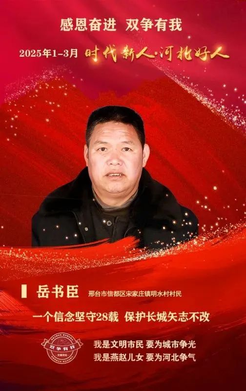 岳书臣,男,1972年12月出生,邢台市信都区宋家庄镇明水村村民。从1997年开始,岳书臣负责守护村庄附近的马岭关古长城。到目前为止,已经有28年了。他的巡逻次数不少于3000次,线路累计达到6万英里。它守护长城的故事曾经被央视新闻“中国之音”、长城网等多家媒体报道。先后荣获“优秀长城保护员”、“泉城好人”等荣誉称号。