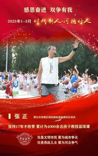 一九五二年九月出生的张正,中共党员,邢台市信都区团结路街泉南社区居民。张正曾经是一名职业篮球运动员。从2008年开始,他连续17年暑假免费教孩子打篮球,为4000多名孩子完成了人生的“第一堂篮球课”。自从开了这个篮球训练营,即使他现在定居石家庄,张正每年暑假都会准时回来。他每天早上6点到达活泉公园,6点半开始和孩子们一起练习篮球。获得“邢台好人”荣誉称号。