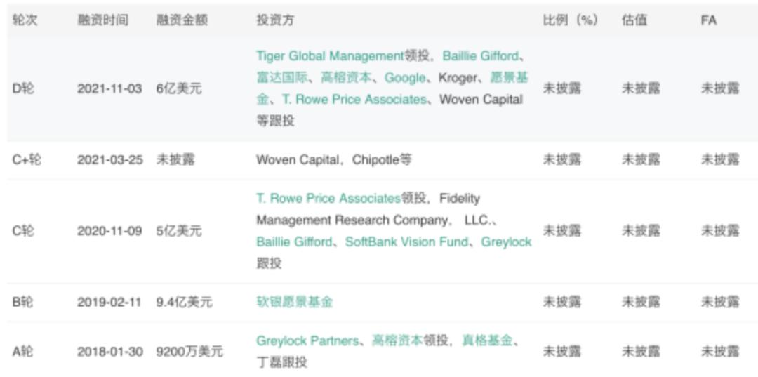 Nuro于2021年12月再次完成了由老虎环球基金领先的6亿美元D轮融资,Baillie Gifford、Fidelity Management & Research Company, LLC、高榕资本、Google、Kroger、一期软银愿景基金,T. Rowe Price Associates, Inc.其基金、丰田汽车基金Woven Capital,以及目前其他股东参与投资。